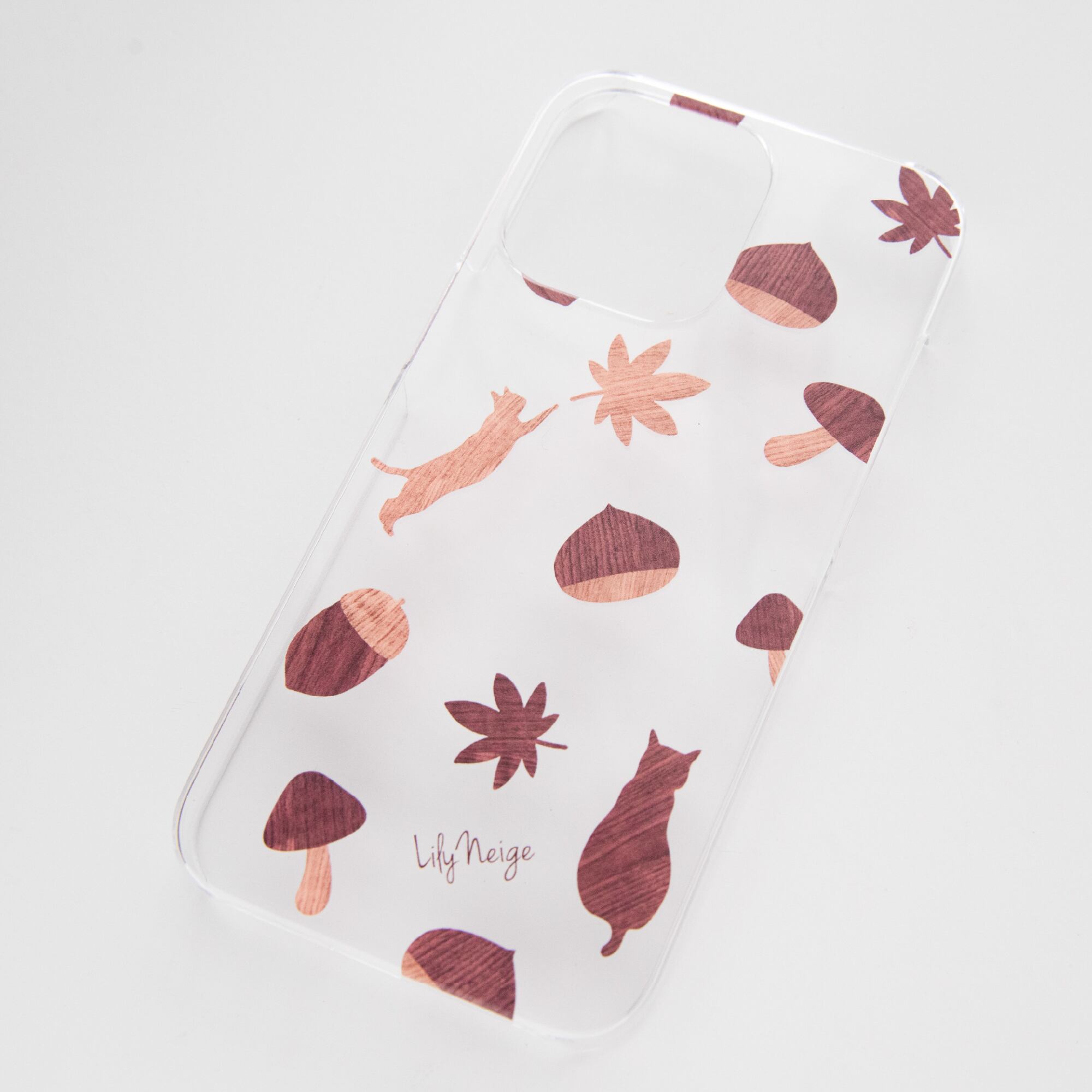 秋の猫のスマホケース 秋のウサギのスマホケース 木目 栗 どんぐり もみじ
